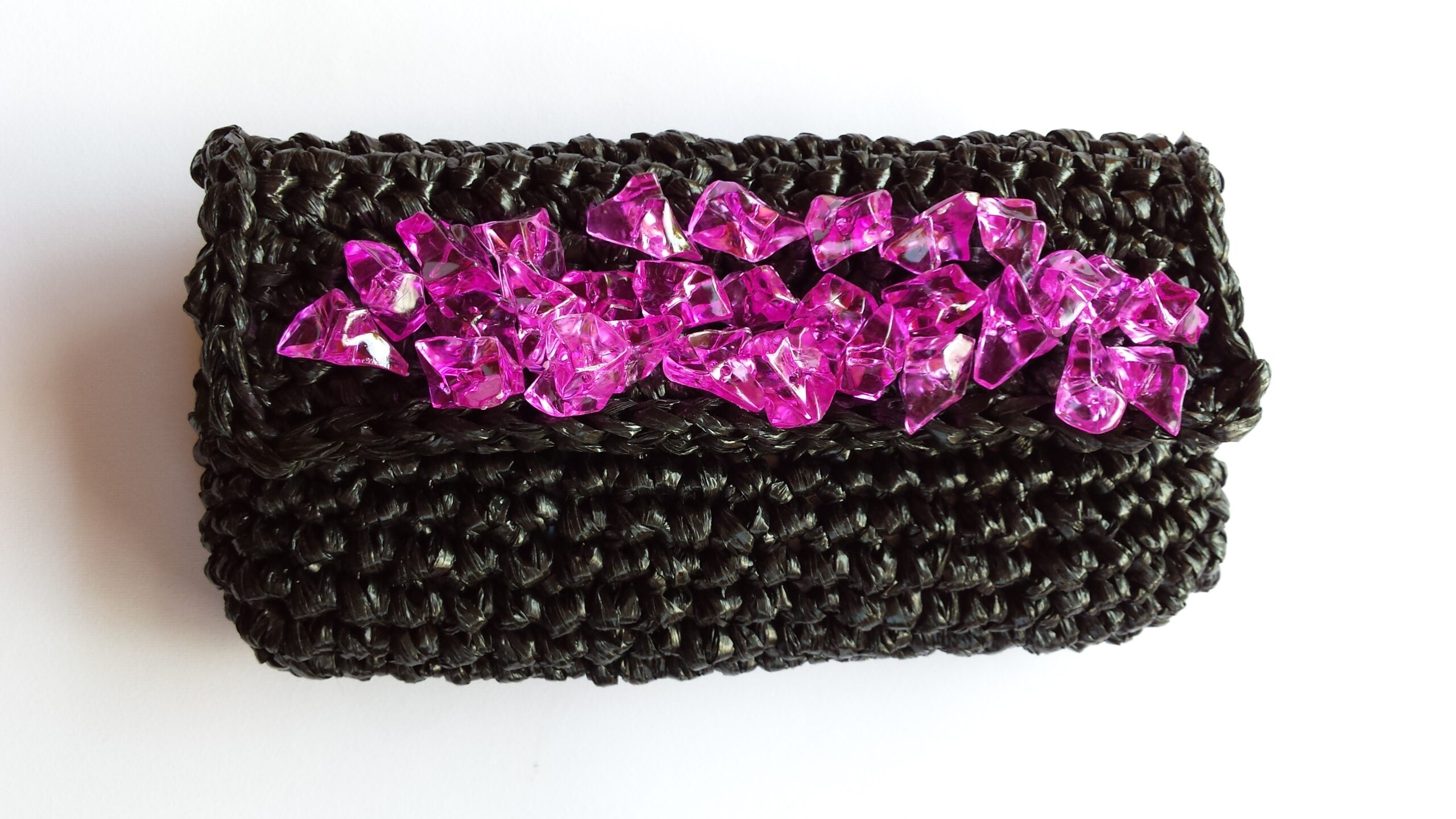 La pochette in rafia lavorata a crochet è un piccolo capolavoro d’artigianato che unisce eleganza naturale e dettagli tono su tono.